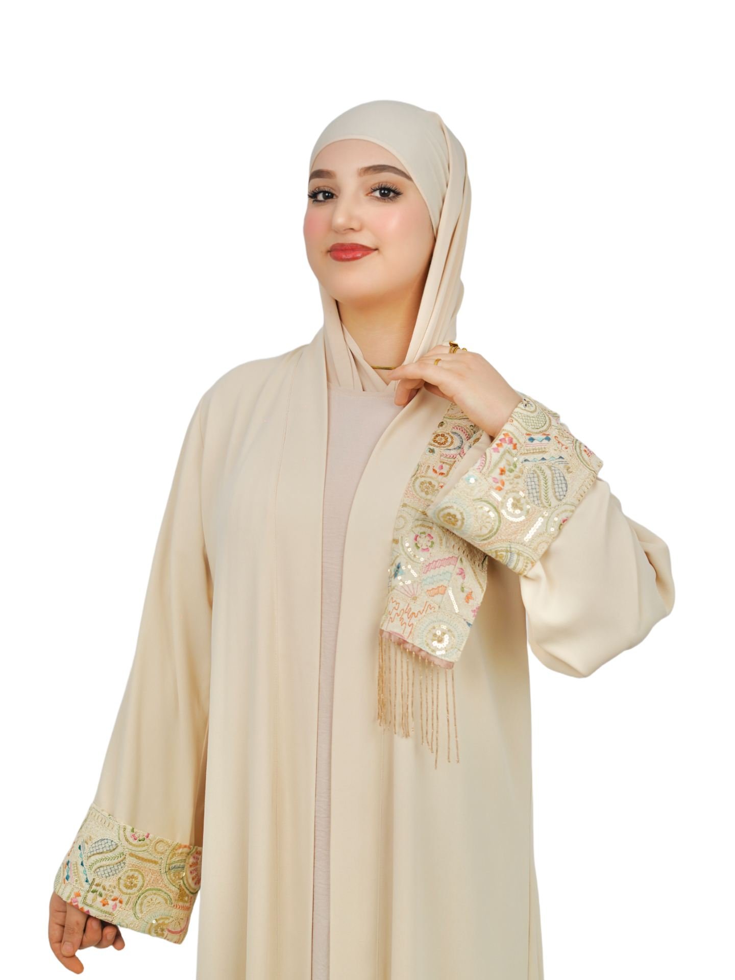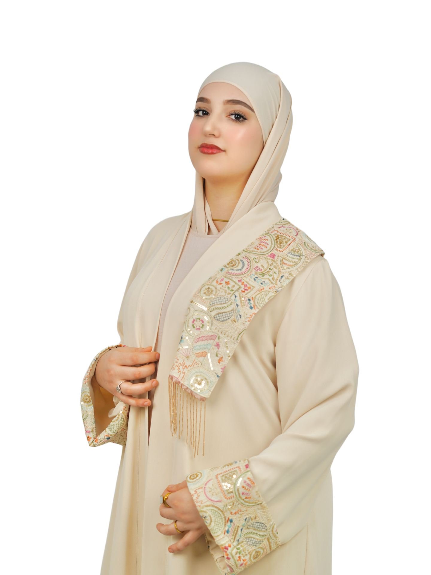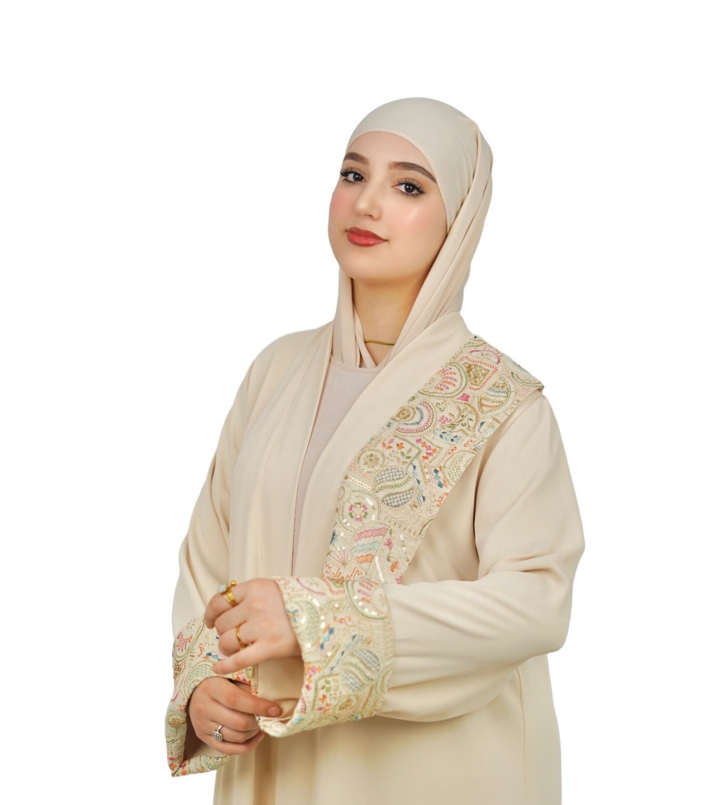 The Kimono Noor is a special piece that brings together modern style and traditional Moroccan beauty. Named “Noor” for the light and brightness it brings to your look, this kimono-style abaya is designed to make you feel elegant and confident. Whether it is for Eid, a wedding, or a special evening.